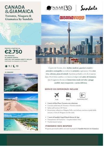 Puoi iniziare da Toronto, una città dinamica con grattacieli, quartieri multiculturali e attrazioni come la CN Tower. Da qui è facile visitare le famose Cascate del Niagara, uno spettacolo naturale impressionante.