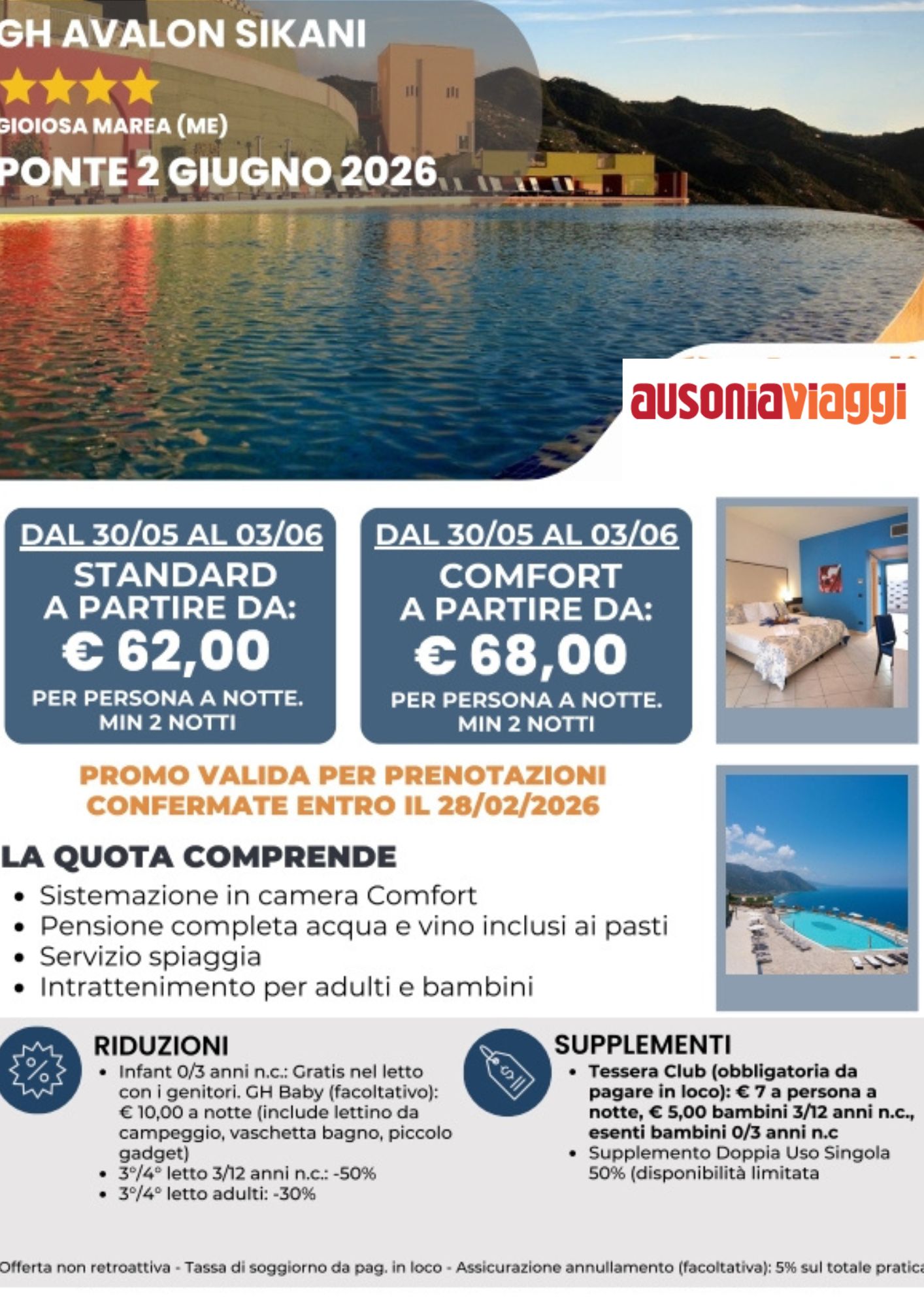 Soggiorno di minimo 2 notti compreso tra il 30 Maggio ed il 3 Giugno 2026
