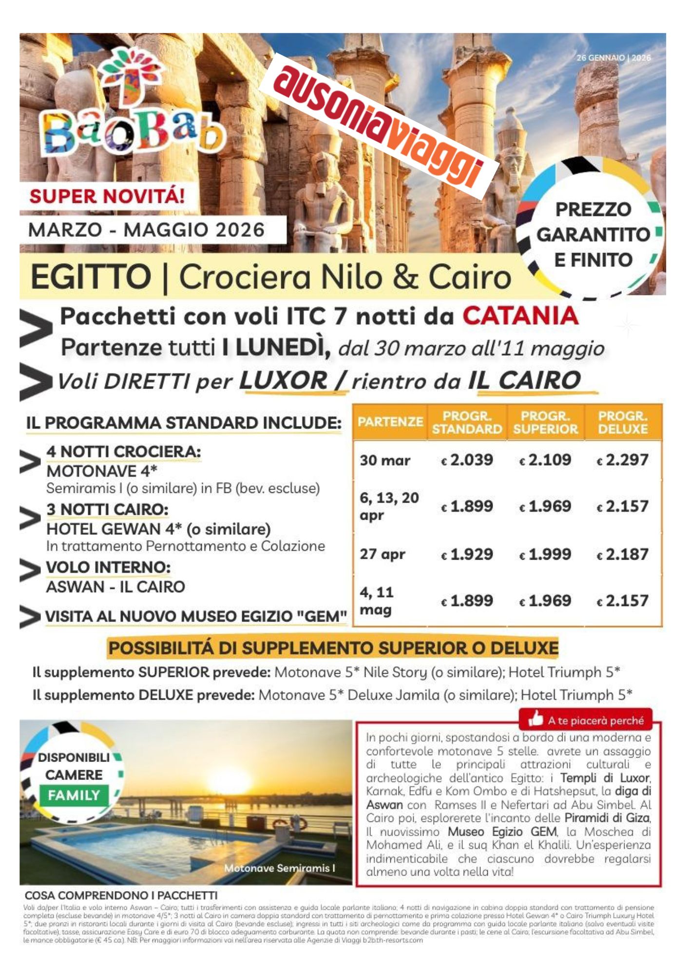 4 notti in crociera a bordo di MN4 stelle in pensione completa + 3 notti al Cairo in hotel 4 stelle in pernottamento e prima colazione;