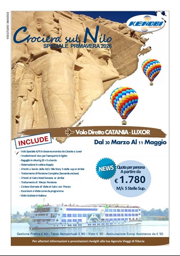 4 notti in crociera a bordo di MN4 stelle in pensione completa + 3 notti al Cairo in hotel 4 stelle in pernottamento e prima colazione;