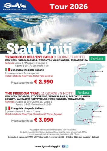 Si parte da New York, la città che non dorme mai, con il suo skyline iconico, Central Park, la Statua della Libertà e l’energia travolgente di Times Square. Ogni quartiere ha un’anima diversa, tra cultura, arte e modernità.