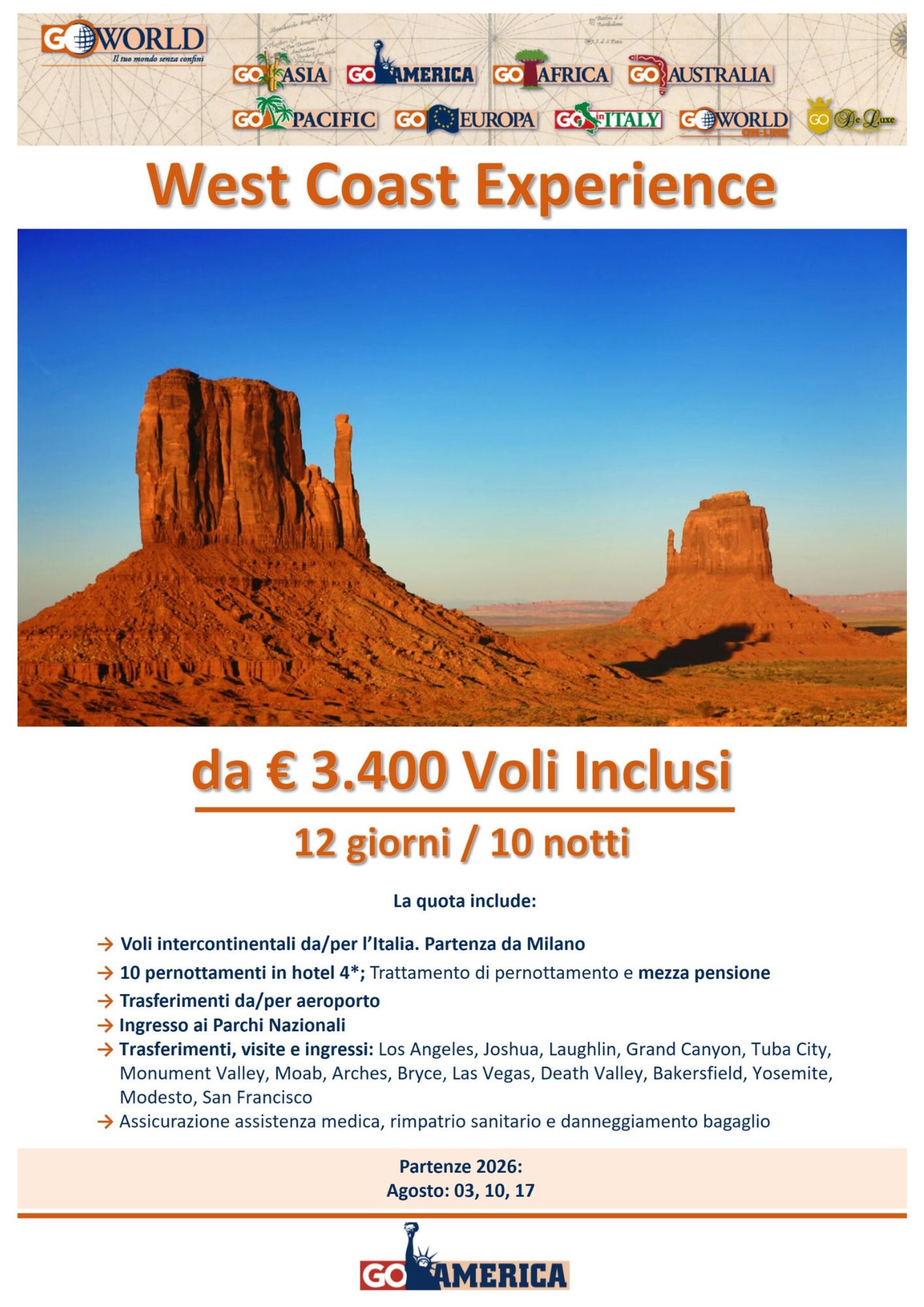 Il viaggio continua verso l’interno, dove la natura diventa protagonista assoluta: lo straordinario Yosemite National Park, con le sue pareti di granito e le cascate imponenti; la magia del Grand Canyon, immenso e maestoso; le formazioni rocciose della Monument Valley e le luci scintillanti di Las Vegas, oasi di divertimento nel deserto del Nevada.
