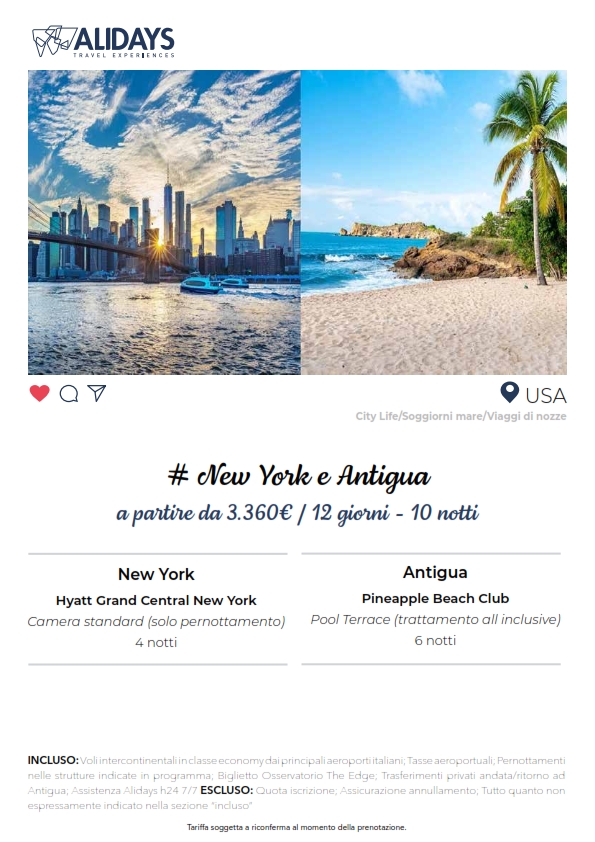Un viaggio di nozze tra New York e Antigua è una combinazione perfetta di energia urbana e relax caraibico: prima il fascino travolgente della città che non dorme mai, poi il mare cristallino e la tranquillità tropicale.