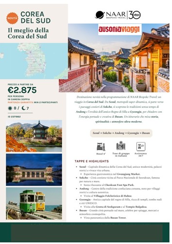 La Corea del Sud è un Paese dove antichi palazzi e templi convivono con grattacieli futuristici e quartieri ultramoderni. È una destinazione perfetta per chi vuole scoprire una cultura diversa, ma allo stesso tempo accessibile e ben organizzata.