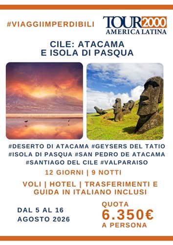 Un viaggio in Cile e all’Isola di Pasqua offre un mix unico di paesaggi naturali e cultura antica. In Cile si possono visitare le grandi città come Santiago, le montagne delle Ande, i deserti del nord e i laghi e i ghiacciai del sud. L’Isola di Pasqua, invece, è famosa per le misteriose statue moai e le tradizioni della popolazione Rapa Nui. Tra natura, storia e cultura, questo viaggio regala esperienze indimenticabili e panorami spettacolari.