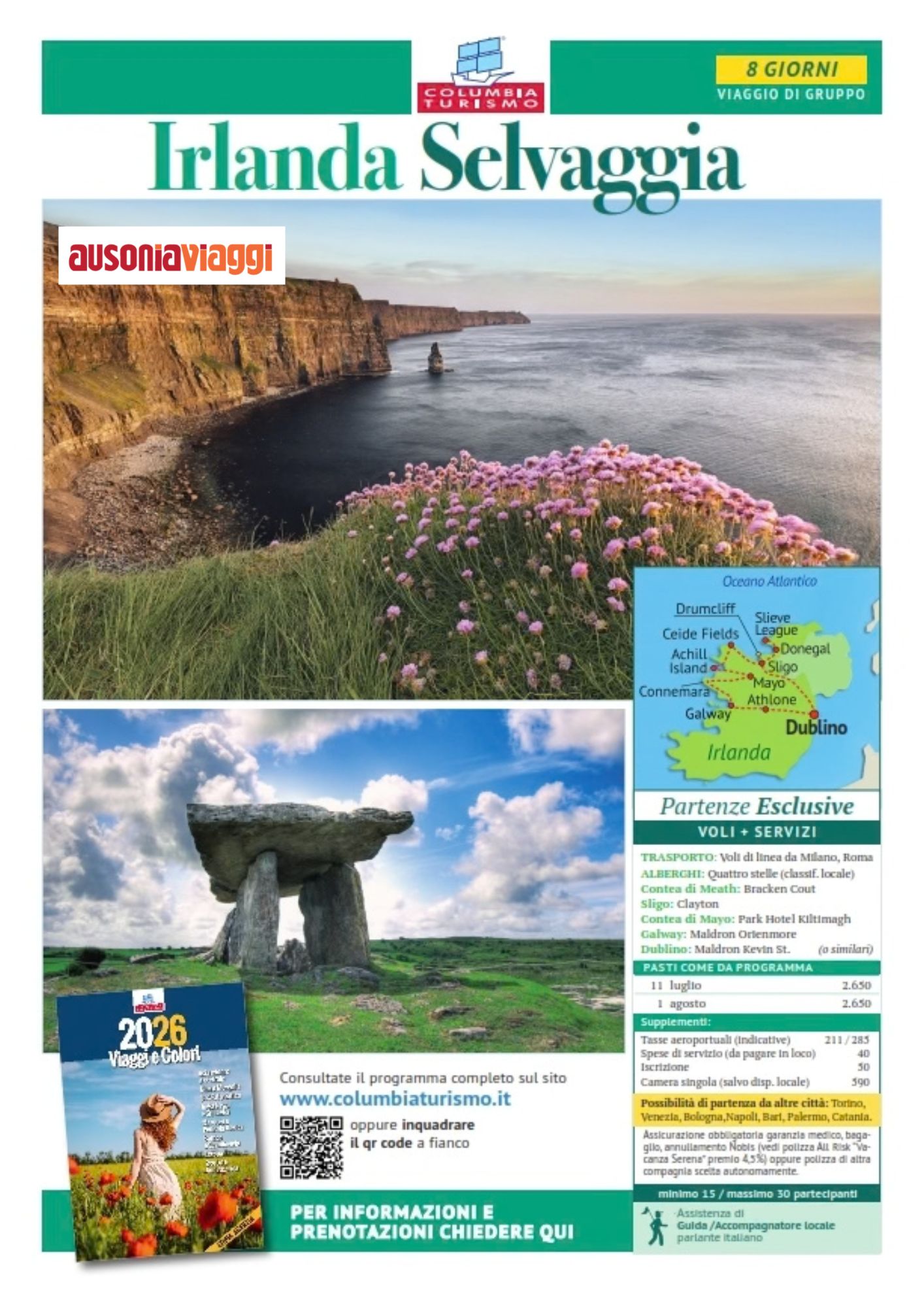 Durante il tour si esplorano anche i meravigliosi paesaggi naturali dell’isola. Uno dei luoghi più spettacolari sono le Scogliere di Moher, alte scogliere a picco sull’Oceano Atlantico, che offrono panorami mozzafiato.
