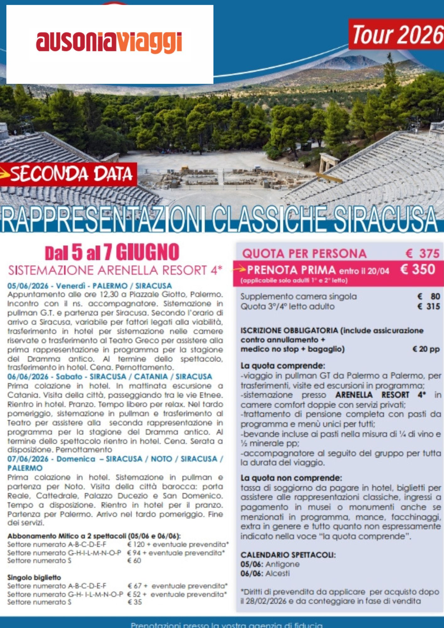 Rappresentazioni classiche di Siracusa da Palermo dal 5 al 7 Giugno 2026
