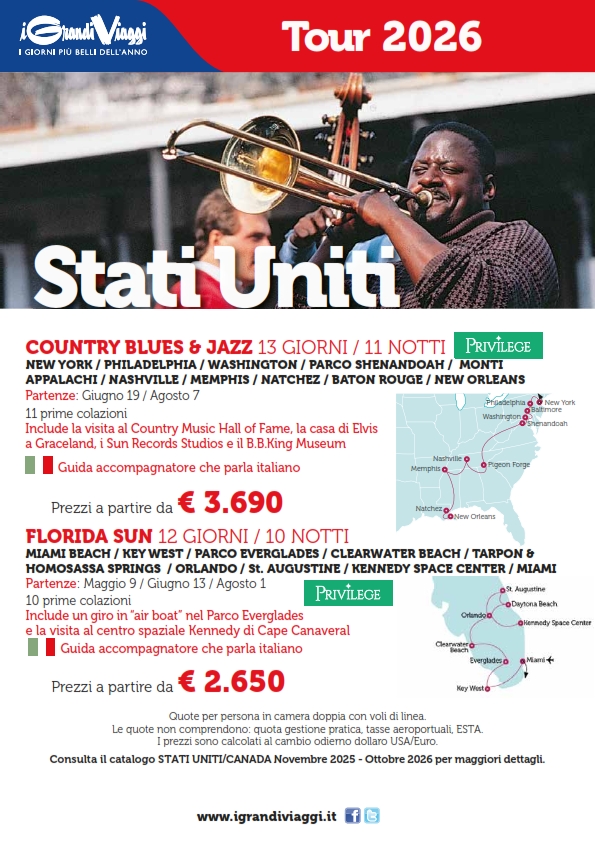 Si parte spesso da New York, con il suo skyline inconfondibile, Times Square illuminata e Central Park che offre una pausa verde nel cuore di Manhattan. Proseguendo verso sud si arriva a Washington D.C., elegante e solenne, con la Casa Bianca, il Campidoglio e i monumenti dedicati ai grandi protagonisti della storia americana.