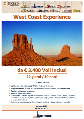 Il viaggio continua verso l’interno, dove la natura diventa protagonista assoluta: lo straordinario Yosemite National Park, con le sue pareti di granito e le cascate imponenti; la magia del Grand Canyon, immenso e maestoso; le formazioni rocciose della Monument Valley e le luci scintillanti di Las Vegas, oasi di divertimento nel deserto del Nevada.